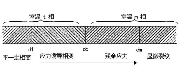 誘發(fā)顯維裂紋的臨界直徑dm。當(dāng)d>dc的晶粒室溫下為m相,由于相變的體積效應(yīng),產(chǎn)生顯微裂紋或應(yīng)力。d>dm的晶粒相變時(shí),相變產(chǎn)生的積累變形大,誘發(fā)顯微裂紋。dc>d>dm的晶粒相變時(shí),相變產(chǎn)生的積累變形小,不足誘發(fā)顯維裂紋,當(dāng)其周?chē)嬖跉堄鄳?yīng)力。