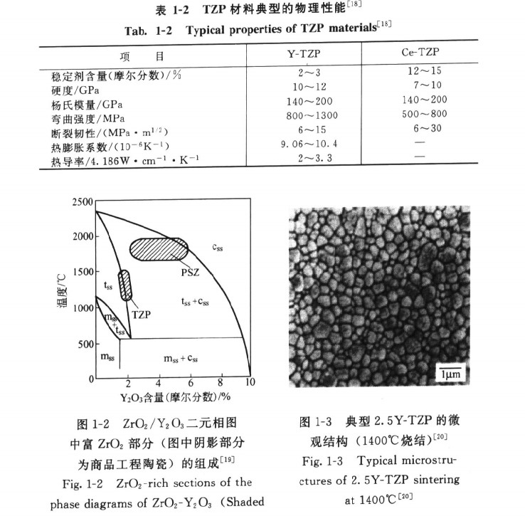 其中TZP是ZTC材料中室溫力學性能最高的一種材料(其力學性能見表1-2181),TZP中又以Y2O2作為穩定劑的Y-TZP應用最為廣泛。TZP材料的制備以相圖(圖1-2)作指導19,穩定劑Y2O3的含量在1.75%~3.5%(摩爾分數)范圍變化。t-ZrO2的含量取決于組成、燒燒結溫度和時間般在60%~100%之間變化。典型的TZP材料徵觀結構為粒徑為0.5~2m的等軸晶組成的均勻組織21(如圖1-3所示)。當原料中含有異類組分(如SiO2)時,在界面上往往存在由異類組分和Y2O3組成的玻璃相。