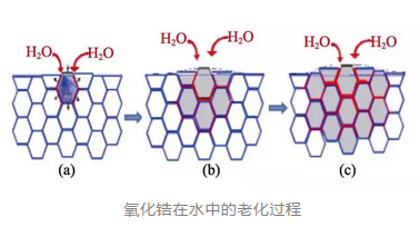 ②隨后,環(huán)境中的水分通過微裂紋滲透到材料內(nèi)部,進一步引發(fā)材料內(nèi)部的氧化鋯發(fā)生t→m轉(zhuǎn)變。